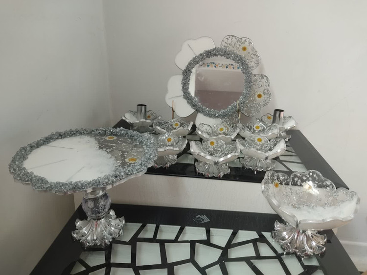ست شکلات خوری و شیرینی خوری رزینی: قابل سفارش بصورت تکی هم هستن،میشه ظرف شیرینی رو بعنوان استند کیک هم استفاده کرد
