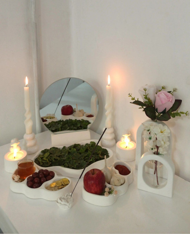 این ست شامل آینه ، جای آینه، ظرف دفرمه جای سبزه، دوتا ظرف دفرمه برای چیدمان سین های هفت سین، دوتا جاشمعی ، جاعودی،دوتا گلدان گلجا گنبدی به همراه لوله های شیشه ای داخل گلدان دوتا شات شمع مار نماد سال 1404🐍دوتا شمع قلمی مارپیچ: قابل شستشو و قابل سفارش در رنگبندی مختلف