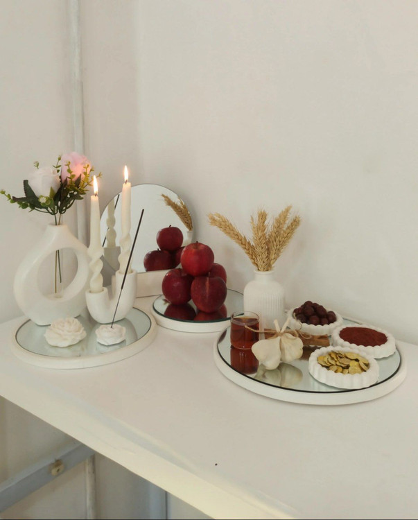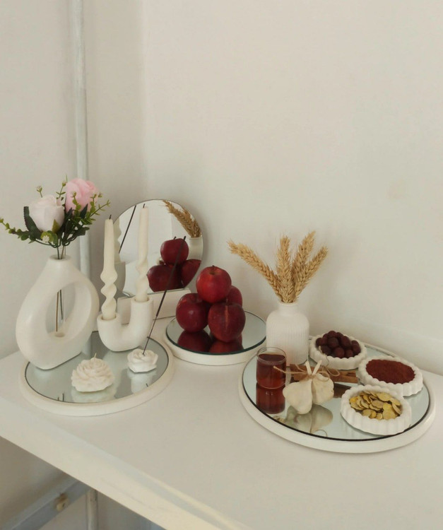 این ست شامل سه تا سینی آینه کاری،گلدان های گنبدی به همراه لوله شیشه ای جاعودی و شمع آلاله گلدان مراکشی سه تا شات کاسه به همراه پایه آینه