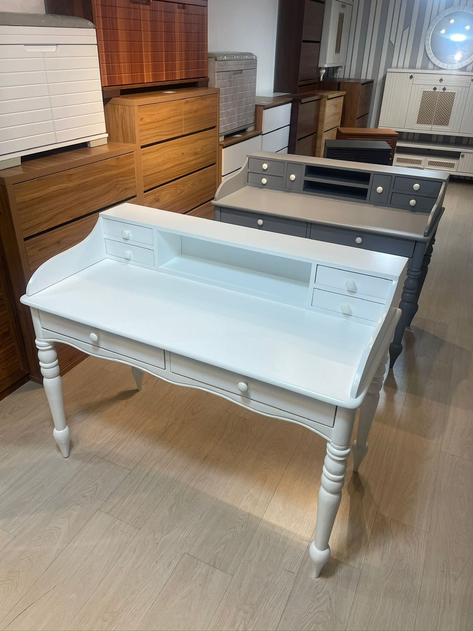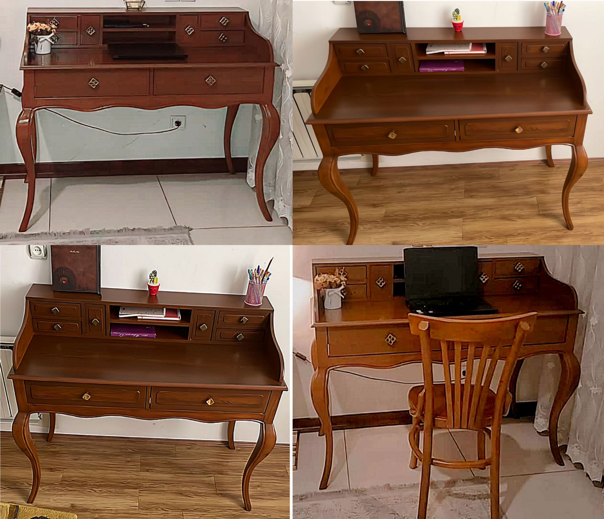 این میز تحریر با دو کشوی کاربردی در زیر صفحه و چهار کشوی کوچک در روی میز فضای مناسبی برای اسناد ، مدارک و لوازم تحریر ایجاد می کند، این میز از چوب راش و روکش چوب راش ساخته شده که بسیار مقاوم و زیباست.